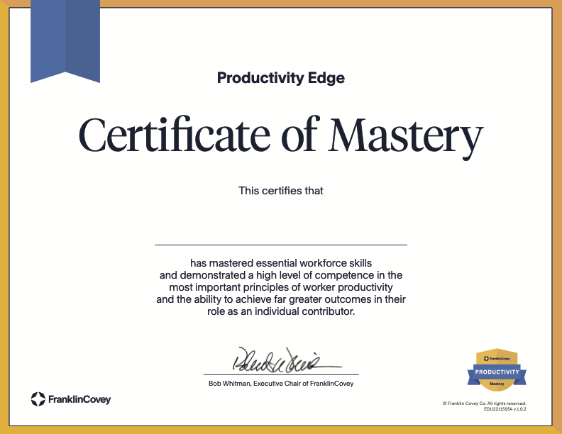 Complete the four productivity courses and submit a final work portfolio to earn a Certificate of Mastery in Productivity – a prestigious FranklinCovey credential, recognized by employers around the world.